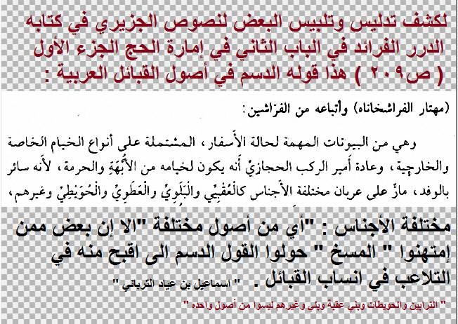 ( ص 209) عادة أمير الركب الحجازي لخيامه الأبهه والحرمة لا ساربالوفد ماراً على عربان مختلفة الأجناس كالعقبي والعطوي والحويطي وغيرهم والأجناس هنا في هذا النص تعني الأصول المختلفة وبهذا النص بطل ما ذكره الجزيري عن نسب الترابين وغيرهم , وسيتذرع البعض بأن النسبة لتربة هي التٌربي وليس الترباني ليوهم صغار العقول ان مسقط جد الترابين منطقة تربان القاحلة في شمال محافظة العقبه وهو وادي ضيق لا زرع فيه ولا مصدر مياه يبعد عن الحدود الفلسطينية بض كيلو مترات وهذا مجافي للحقيقة . فقد أوضح أوبنهايم وحقق في موسوعة البدو كثيراً إنه لا قواعد لغوية عند البدو في التسميات والتحريف والتصحيف !! فقد ذكر المؤرخ والنسابة عاتق بن غيث البلادي الحربي رحمه الله عندما ذكر الجزيري في كتابه الدرر الفرائد إن ( الجعافرة من عنزة من بلي ) قال: إن علم النسب في القبائل المتخالطة في السكن أو الجوار أو المتحالفة لا يعرف حقيقة نسبها مضبوطاً سوى إبن البيئة المقيم لا الرحالة المتنقل العابر مثل الجزيري وامثاله. وهذا الشيخ المؤرخ حمد الجاسر والذي دأب البعض بالأشارة له نفى بقمية الترابين في رسالته المشهورة للشيخ اجميعان ابن جرمي , وقد اعتمد في رده على ما جاء في كتاب الجزيري الدرر الفرائد وهذا قول مغلوط فالجزيري ذكر ان العربان أجناس مختلفة أي من أصول مختلفة , ولم يطلع المؤرخ حمد الجاسر لذلك النص ولتراجع عن قوله رحمه الله ولدار مع الحق حيث دار . قلت : يتوهم لبعض ممن لا يفرق بين الحيض والبيض حين اشار عارف العارف لمسقط جدنا عطية [ تربة ] وإن من سكانها [ البقوم ] فأخذ النص على عواهنه دون تحقيق . فأقول لهؤلاء : [ تربة ] سكنتها قبائل كثيرة بما فيهم جزء من قريش والمعروف ان القبائل متموجة والديار ثابته وكون قبيلة تسكن هذه الديار أو تلك لا يعد دليلاً دامغاً أو قاطعاً على نسبتها الى من سكن هذه الديار في عصر الجاهلية أو صدر الأسلام [ محمد بن فهد العوفي ] وقال الشريف محمد بن منصور في كتابه قبائل الطائف واشراف الحجاز [ ص119] أرى إن وجود قبيلة من القبائل اليوم في منازل اخرى من قبائل العرب القديمة ليس في مرجح لالحاق هذه القبيلة بتلك لمجرد اننا وجدنا منازل تلك هي ديار هذه في عصرنا والسبب ان تموج القبائل في الجزيرة العربية أمر معروف من القديم فكم قبيلة كانت في الجنوب ونزحت الى الشمال .والبعض يستند في كذبه وتدليسه في نسب قبيلة الترابين بما قاله أحد الشعراء , فلا يؤخذ به وليس لكلامه قبلة أو محراب , فهذا شاعر وليس بمؤرخ اطلع على المراجع العلمية وامهات الكتب , قال تعالى في سورة الشعراء : (وَالشُّعَرَاء يَتَّبِعُهُمُ الْغَاوُونَ* أَلَمْ تَرَ أَنَّهُمْ فِي كُلِّ وَادٍ يَهِيمُونَ* وَأَنَّهُمْ يَقُولُونَ مَا لَا يَفْعَلُونَ)؟ وتفسيرالأمام الطبري لـ (ألم تر أنهم في كل واد يهيمون) يقول تعالى ذكره: ألم تر يا محمد أنهم يعني الشعراء في كل واد يذهبون كالهائم على وجهه على غير قصد بل جائرا عن الحق وطريق الرشاد وقصد السبيل، وإنما هذا مثل ضربه الله لهم في افتننانهم في الوجوه التي يفتنون فيها بغير حق فيمدحون بالباطل قوماً ويهجون آخرين كذلك بالكذب والزور.وأخرج ابن كثير بسنده في قوله تعالى: (وأنهم يقولون ما لا يفعلون) عن علي بن أبي طلحة عن ابن عباس: أكثر قولهم يكذبون فيه، قال ابن كثير: وهذا الذي قاله ابن عباس رضي الله عنه هو الواقع في نفس الأمر، فإن الشعراء يتبجحون بأقوال وأفعال لم تصدر منهم ولا عنهم فيتكثرون بما ليس لهم. فهذا هو معنى تلك الآية. وعود على بدأ : لم يعتمد المؤرخ حمد الجاسر كتاب الجزيري الدرر الفرائد في أنساب قبائل الجزيرة العربية حين كتب عن انساب تلك القبائل فقد ذكر الجاسر في كتابه المعجم الجغرافي للبلاد العربية.. السعودية شمال المملكة امارة حايل والجوف وتبوك وعرعر والقريات القسم الأول ص(12) ان قبائل بني عقبة وبني عطية .. تمت بصلة النسب لقبيلة عذرة ومن المعلوم عند جميع النسابة ان قبيلة عذرة من قبائل قضاعة أي إن الجاسر من خلال نصه هذا اعتبر هذه القبائل من